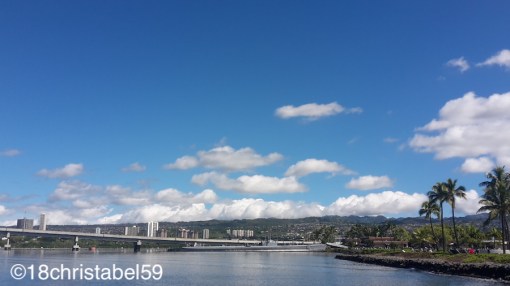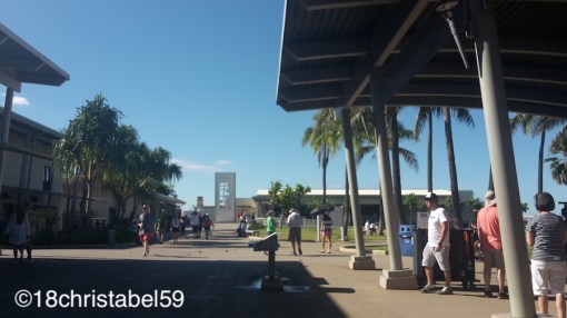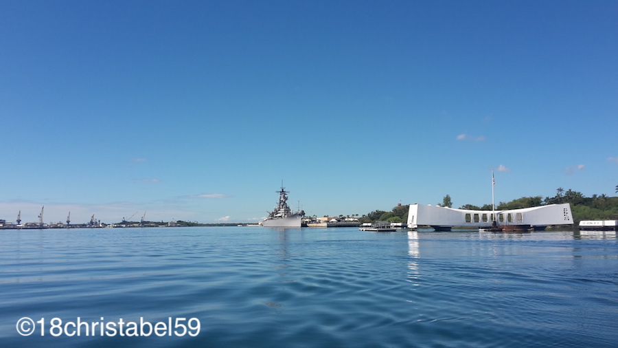 Das Parken sowie der Eintritt für die Parkanlage und das Battleship USS Arizona Memorial sind kostenlos. Die Arizona wurde 1941 versenkt und liegt noch heute an ihrem Anliegeplatz, an dem sie gesunken ist. Sie ist das Grab von 1177 Besatzungsmitgliedern, die am 7. Dezember schlagartig ihr Leben verloren. Deswegen gilt das Schiff als Memorial und Friedhof und kann kostenlos besichtigt werden. Über dem gesunkenen Kampfschiff wurde in den 60ern ein strahlend weisser Besuchergang gebaut, der die Arizona nicht berührt und aus dem man das Schiff näher betrachten kann. Leider war der bei unserem Besuch nicht begehbar („under construction“), sondern nur vom Boot aus zu sehen, das die Besucher normalerweise zu dem Memorial fährt.