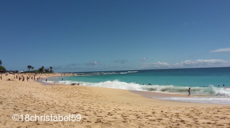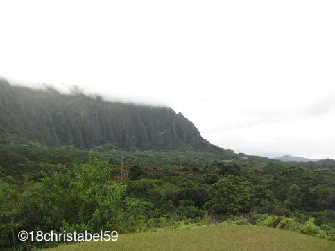 Nach einem kurzen Snack sind wir weitergefahren und dabei in den Stau gekommen, jawoll, Samstagmittag, ruckelte bei uns der Verkehr nur im Schritttempo vorwärts. Zur linken Seite türmten sich die grünen Berge auf, in den die Wolken festhingen (es hatte zu tröpfeln begonnen), und rechts zeigten kleine Strandvillen in den verschiedensten Stilen, die durch Büsche von der Strasse her geschützt wurden. Ab und zu konnte man den türkisblauen Ozean mit einem Stückchen hellen Sand sehen. So schön. In Waimanalo standen wir teils vollständig, denn da wurde auf jeder öffentlichen Grünfläche was gefeiert wurde, hauptsächlich Kindergeburtstage, und er BBQ-Grill-Rauch zog in Schwaden über die Strasse. Voll cool. Danach rollte der Verkehr wieder.