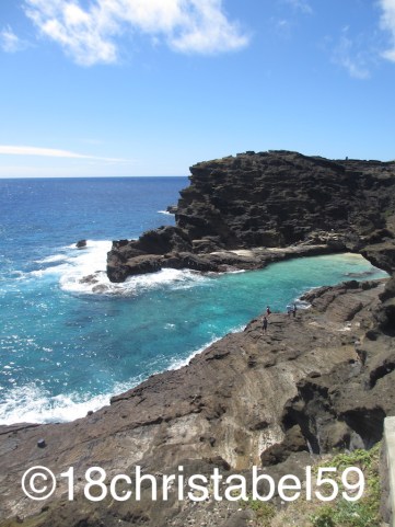 Also haben wir uns in die Autoschlange gen Osten eingereiht und wollten eigentlich an der Hanauma Bay rechts abbiegen, aber dat war wohl nüscht, weil der Parkplatz schon voll war. Und wir waren um 10:30 Uhr da. Wir haben uns eine mentale Notiz gemacht, dass wir am nächsten Tag doch vorher hierher kommen müssten und wir sind weiter gefahren, bis der Highway 72 eine fette Linkskurve gemacht hat und wir am Lanai Lookout angehalten haben. Die Aussicht hier ist wirklich phantastisch. Der Lookout befindet sich auf wunderschönen Lavafelsen, der sich in den verschiedenfarbigen Schichten von Grau-, Schwarz- und Brauntönen zeigte. Die Felsen leuchteten in der Sonne und standen im krassen Kontrast zu dem türkisblauen Wasser dahinter. Die Wellen brachen sich mit weisser Gischt an den rauen Felsen, dazwischen hat die Natur schmale helle Strändchen eingerichtet und gen Osten konnten wir Sandybeach sehen, an dem eine fette Wellenreihe nach der anderen anrauschte. In der Ferne sah man die schattigen Umrisse von der Insel Lanai. Und Wale. Auf dem Felsen haben sich nicht nur tolpatische Touris (nein, nicht ich) versammelt, um über die Felsen zu klettern und Fotos zu machen, sondern da waren auch gut ausgerüstete Walegucker (Whale Watcher), die da mit Campingstühlen, Basecaps, Kühltruhen, Sonnencreme und Ferngläsern auf offene Meer starrten. Ein Herr rief sogar die Richtung in die Menge: „11 o’clock!!“ Und alle Köpfe drehten sich in die Richtung, die Ferngläser wurden gelüpft und man sah Fontänen und die Buckel der Wale. Ein Traum.