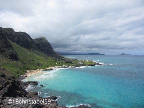 Unsere Weiterfahrt führte uns zum Makapu’u Aussichtspunkt mit Blick auf zwei vorgelagerte Inseln, eine davon ist Rabbit Island, die andere ein Vogelschutzgebiet mit einem kompliziertem Namen. Ausserdem sieht man von hier kleine Strände und kann bis auf felsigen Grund des Meeres schauen, sowie den Wellen beim Spielen zusehen. In der Ferne gen Norden sah es nach Regen aus, denn da bauschten sich die grauen Wolken auf, die sich an den grünen Bergen verfingen. Aber dieser Ausblick auf die grünen Berge, den grauen Himmel, der über dem Meer hellblau wurde, dann die gelben Strände und das klare, türkise Wasser unterhalb der Klippen war einfach grandios.
