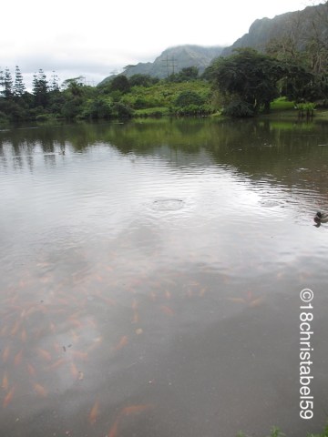 Wir haben am Visitor Center angehalten und haben mit kurzem Spaziergang zum See runter gemacht. Der Weg führte an vielen verschiedenen tropischen, beschilderten Bäumen, Sträuchern und Blüten vorbei, bis wir auf einer grösseren Lichtung mit einem schlammigartigen See ankamen. Bis hierher war der Park für uns nicht so ganz das, was man von einem botanischen Garten erwartet hätte. Aber dann haben wir uns umgedreht und diese majestätische Bergkette mit den Wolken in den Bergspitzen hinter uns gesehen. So unglaublich schön, dass man fast gar nicht mehr weg gucken konnte. Am See selbst hatten Enten mit Küken sowie Mungos ihren Lebensraum und im Teichwasser selbst schwebten Hunderte von Goldfischen und Welsen derart nebeneinander, dass sie eine Art Teppich bildeten. Richtig krass. Etwas unheimlich auch.