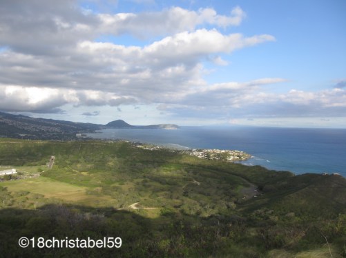 Alter Falter, da hab ich gedacht, dass meine Beine fast abfallen, als wir in dem Höhlendurchgang oben ankamen, der gerade mal 2m hoch ist. Aber das ist noch nicht das Athletischste an dieser „Abkürzung“. Nachdem man eine metallene Spindeltreppe hochgewackelt ist, muss man noch eine Leiter rauf und dann durch ein Loch kriechen, ja richtig, kriechen. Aber dann, Leuts, dann, nachdem man ein paar mal kräftig durchgeatmet hat und den triefenden Schweiss dabei einfach ignoriert, dann kann man die Wahnsinnsaussicht auf Honolulu, Waikiki mit ihren Hochhäusern und das Meer in all seinen Farben und Facetten geniessen. Und bei uns ging die Sonne schon langsam unter und warf ein goldenes Licht auf die Häuserfassaden. Genau wie auf den Krater hinter uns und das bergig, grüne Hinterland sowie die Südostküste und Koko Head in der Ferne.