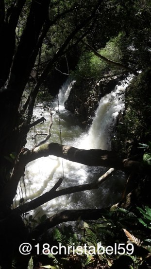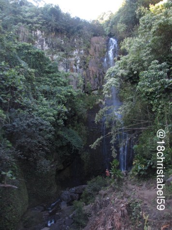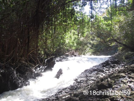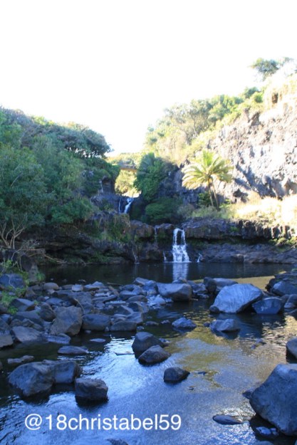 Dann ging es weiter über Highway 360 gen Osten. Der nächste Stopp waren die Twin Falls, zwei Wasserfälle, die parallel in einer beeindruckenden Geschwindigkeit einige Meter in die Tiefen rauschten, mitten im hawaiianischen Dschungel. Um eine gescheite Aussichten zu haben oder Fotos zu machen, mussten wir erstmal etwas viel klettern und die Füsse nass machen. Wer zu dem Wasserfall möchte, in dem man baden konnte, der muss durch das Tor gehen (es gibt nur eins) und dem Pfad folgen. Ja, immer der Nase nach – auch durch den Fluss mit den etwas glitschigen Steinen (vielleicht wäre wasserfestes Schuhwerk ratsam – und keine Chucks). Und der Ausblick lohnt sich, denn der Wasserfall mitten im Dschungel wirkte wirklich wie aus einem Werbefilm.