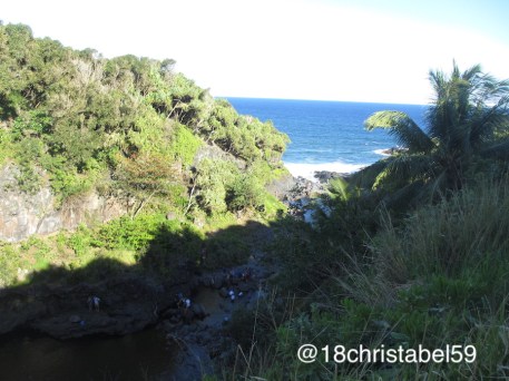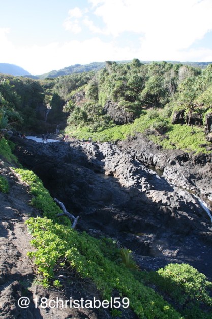 Aber Hana war noch nicht das Ende von unserem Ausflug. Lukas wollte noch weiter gen Osten, er wollte zu den Seven Sacket Pools. Alles, was wir wussten, war, dass wir der Strasse weiter folgen mussten. Was wir auf der Karte oder im Navi nicht sehen konnten, war, dass die Strasse hinter Hana noch enger und holpriger wurde. Also Anfangs war alles noch voller Landschaftsidylle: Die Strasse führte durch grüne Wiesen mit einer Hammeraussicht auf den Vulkan und das tiefblaue Meer. Dann kam eine kleine Ortschaft mit prächtigen Hütten in gepflegten Gärten drum herum, danach folgte wieder Dschungel – noch uriger, dunkler und verwachsener als vor Hana. Die kleine Strasse war sehr kurvenreich, so eng wie unser Hyundai, mit vielen Wasserfällen und kleinen Brücken, deren Tonnenbelastung von mal zu mal kleiner wurde. Die Strassen waren teils so eng, dass es Stau gab, weil das Auto vor uns anhalten musste, um den Gegenverkehr durchzulassen.