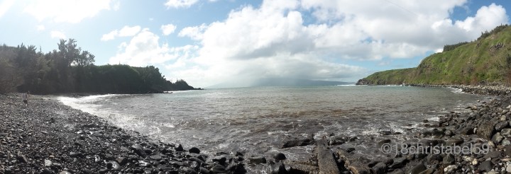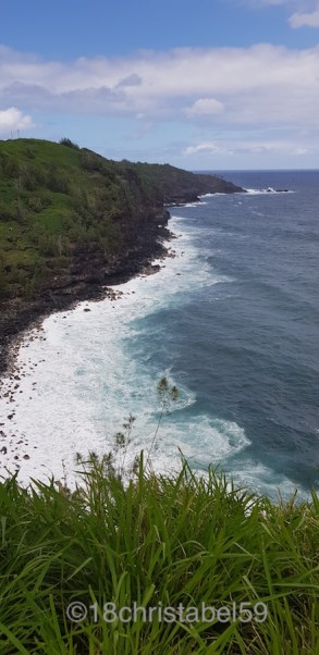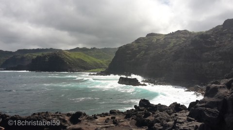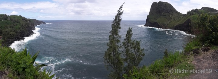 Ab Kapalua geht die Strasse dann rechts gen Osten weg und die grüne Graslandschaft wird mehr und mehr von Steilküste und Hügeln geprägt, mit saftig, grünen Hängen und hohem Gras auf der einen und schwarze, hohe Lavafelsklippen mit versteckten Buchten, berauschenden Brandungen und blau-türkisem Meer auf der anderen Seite. Darüber bauschig, graue Wolken. Ein sehr kraftvolles Bild hat das gegeben. Wer will kann an den zig Parkmöglichkeiten die Aussicht geniessen, die sich jedes mal ändert. Die Strasse an sich ist sehr kurvig, ähnlich wie nach Hana, nur mit breiteren Strassen, jedenfalls wenn man von der Westseite kommt. Aber dazu später mehr.