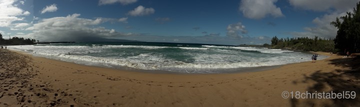 Dahinter ein goldgelber Sandstrand mit hohen, stürmischen Wellen, im blau-türkisen Wasser. Ein wahres Paradies für Surfer, Wasserratten mit Boogieboards oder Einheimische, für mich das nix. Ich war nur mit den Füssen im Wasser, das war angenehm war. Aber Alter Falter, wehte der Wind da. Es zog wie Hechtsuppe, dieses Mal ohne Sandpeeling, und das Gute war: Der Wind wehte die Haare weg.