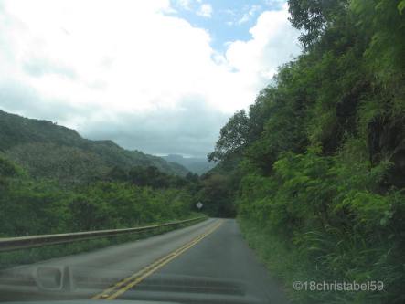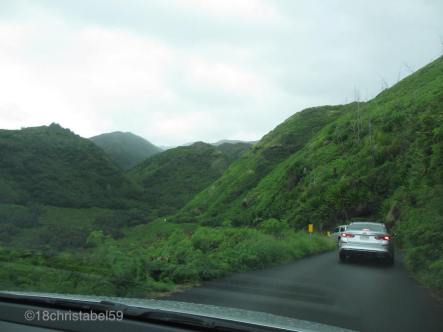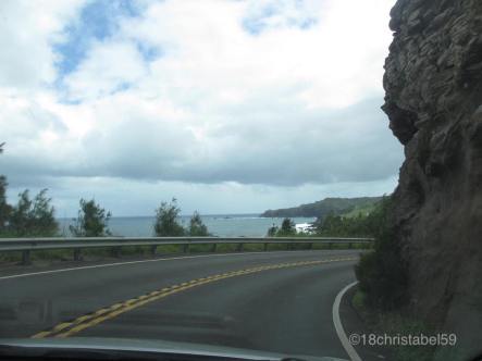 Unser Ziel war es, erst mal bis Kahakuloa zu fahren und dann zu gucken, ob wir weiter wollen. Joa, das wurde erstmal zu einem kleinen Abenteuer, denn kurz vor dem Ziel stand da ein Schild: Auf den nächsten 8 Milen „narrow one pane road“, also enge, einspurige Strasse. Gut, ham wir uns gedacht, das kennen wir schon von der Road to Hana, da wurde es ja auch schon eng. Vor uns waren noch Autos, auch so Touristen, und da haben wir uns eingereiht und sind in einer fröhlichen, unfreiwilligen Kolonne die grünen Küstenhügel abgekurvt.