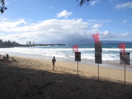 Nach einer Weile sind wir dann wieder zurück, der doofe Hahn war nicht mehr zu sehen, blödes Vieh, ey, und dann hielten wir einfach am nächsten Strand vor Lahaina. Das war der D.T. Fleming Beach Park, an dessen Strandeingang uns gleich mal 3 roten Flaggen begrüssten.