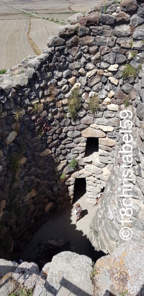Während der Tour haben wir alles Wissenswerte über Su Nuraxi erfahren, das die Wissenschaft so weiss; der Führer beantwortete auch Fragen. Von aussen sieht die Anlage erst mal weniger spektakulär aus; das ändert sich aber, wenn man rein geht (Ein- und Ausgang sind der gleiche Weg, was witzig wird, wenn eine nachfolgende Gruppe entgegen kommt). Ist man einmal oben auf den Überresten des Hauptturms und blickt nach unten, sieht man das Ausmass der Siedlung mit den kreisförmigen Überreste des Dorfes sowie der vorgelagerten Türme. Der Blick in die Ferne der Ebene ist sagenhaft.