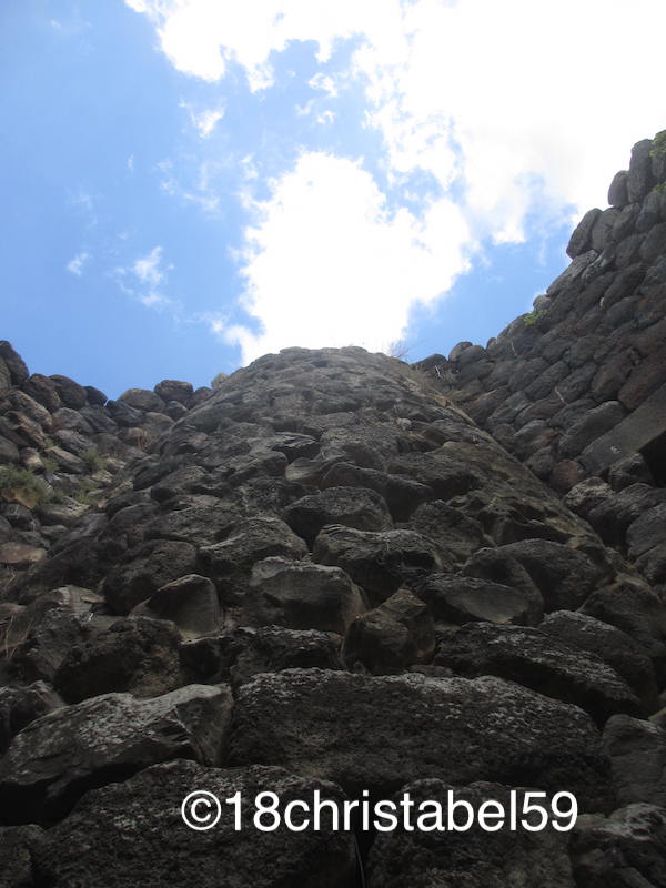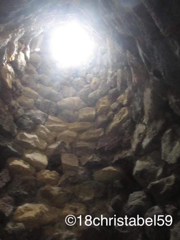 Und dann geht es erst richtig los, mit der Kletterei. Wir sind in den Hauptturm reingeklettert bis zum Brunnenhof. Die „Stufen“ sind uneben und teil 50 cm hoch, der Gang ist keine 50 cm breit und teils niedrig. Der Weg in den Innenhof führt über sehr, sehr (!!) schmale Basalttreppen. Ich bin sie rückwärts runter, damit ich mich besser festhalten kann und nicht stosse. Einmal im Innenhof angekommen, ist man erst mal baff von den massiven Mauern. Hier erkennt man, dass sich die Anlage nach oben hin verjüngt. Im Hauptturm selbst standen wir in der ersten kegelförmigen Kammer und die liegt ca. 10 m hoch. Es ist einfach zappenduster da drin. Zudem sind die vorgelagerten Türme einzeln mit dem Brunnenhof verbunden, teils sind sie durch einen normalen Eingang erreichbar, teils durch schmale Gänge. Wie sich die Menschen damals darin zurecht fanden, ist mir echt ein Rätsel.